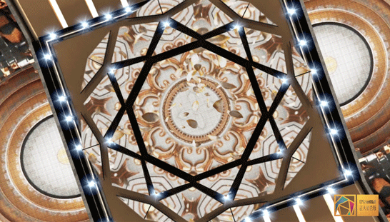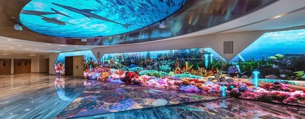宴会厅前厅:配备了房顶、墙壁和地面融合组成的巨型交互式屏幕。使用利亚德VED系列P2.5LED小间距屏幕,不仅能完美地呈现各种特效,还可结合虚拟现实技术来使用。