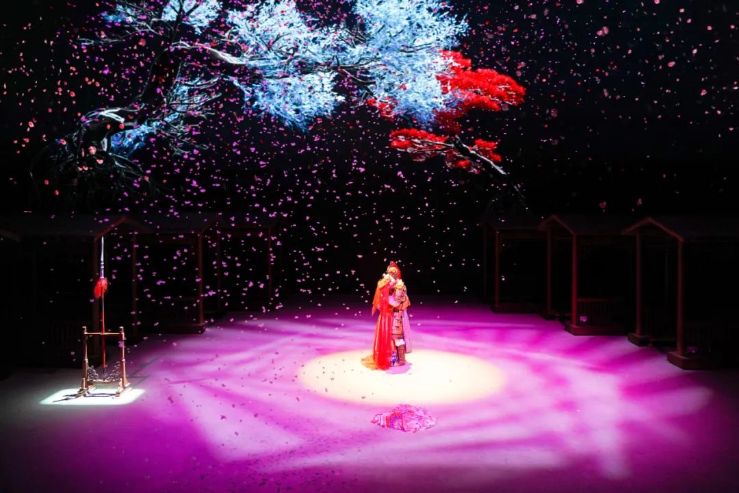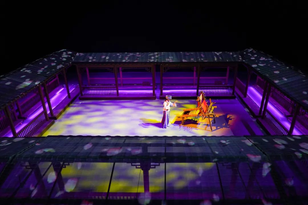 演出首先在视效上完成一个壮举:五个演出空间中,共计铺设了总面积达3000平方米的LED屏幕,相当于半个专业足球场的大小,其中还包括技术较复杂的大面积曲面LED屏幕。这样的大胆应用在沉浸式演出中实属罕见。为最大程度创造质感,创意团队制作了城墙、街道、桥梁、山体、亭台、牌坊、战船,屏幕画面与大量实景结合,完成了对以往沉浸式演艺“全部实景化”或“全部屏幕化”在表达效果上的突破。