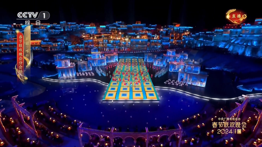 新疆喀什分会场继续欢歌起舞,在利亚德1000多平LED显示产品及30台UHD4K40投影机助力打造的绚丽多彩的舞台中,用《爷爷的萨玛瓦尔》曲目展示美好生活。